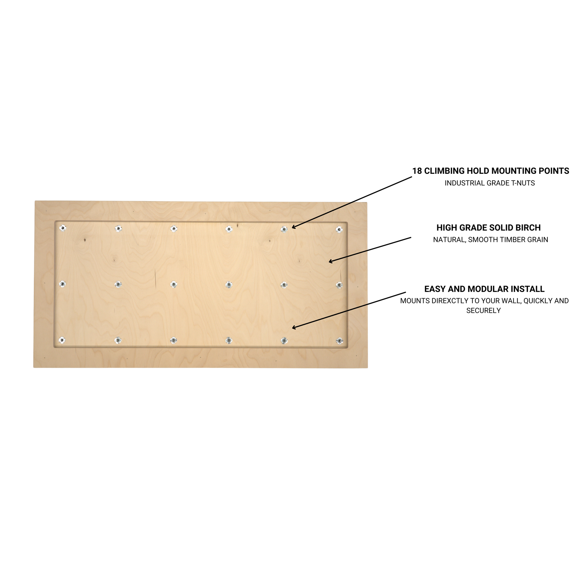 Use only approved climbing holds and fixings compatible with 18–19 mm plywood and installed with M10 T-nuts.